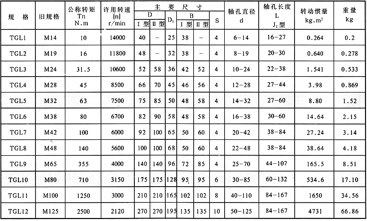 本聯(lián)軸器適用于聯(lián)接兩同軸線傳動(dòng)軸系,并具有一定的補(bǔ)償兩軸相對(duì)位移性能的聯(lián)軸器,具有一定的彈性,工作環(huán)境溫度-20~80℃,傳遞公稱轉(zhuǎn)矩為10~2500KN·m。 TGL型 聯(lián)軸器參數(shù)與尺寸(mm)